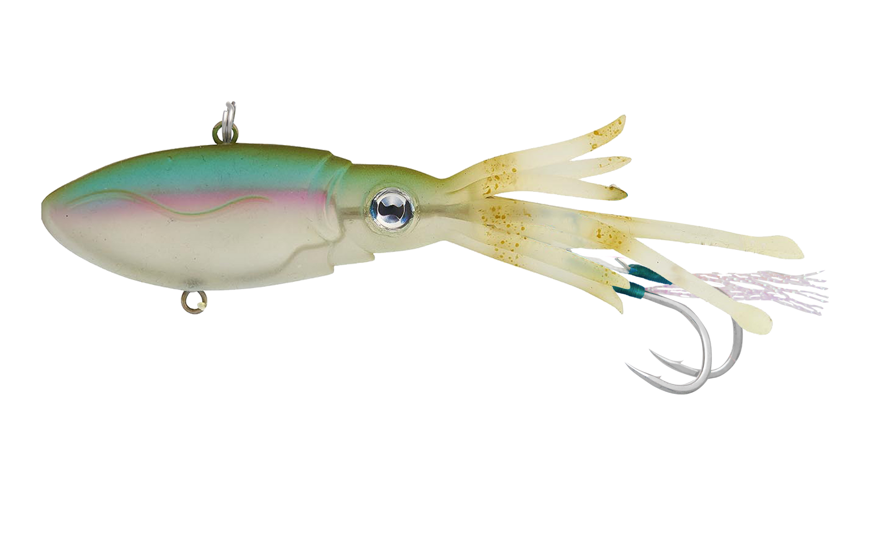 The soft TPE construction allows strength and durability matched with realistic movement of the tentacles which waft and wiggle in the water to entice bites when sinking or even at rest. The heavy duty through wire construction and heavy gauge hooks allow you to fish this lure confidently for big fish. The additional eyelet on the belly allows for additional hook placement as required.